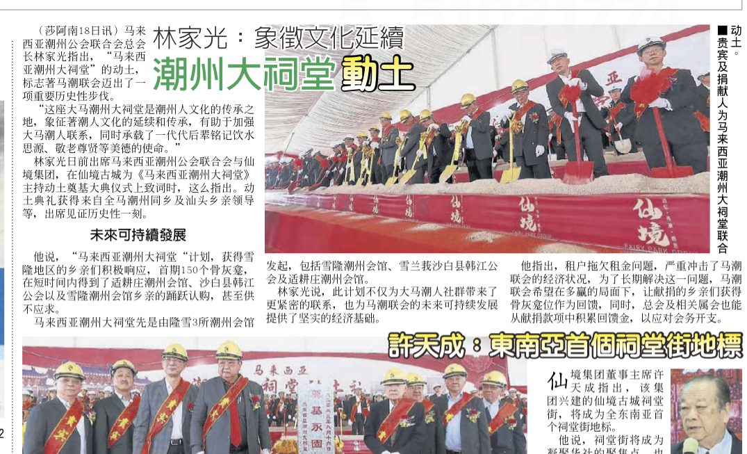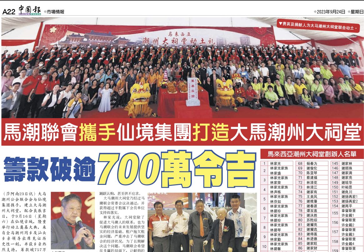 中国报 – 马潮联会携手仙境集团打造大马潮州大祠堂 筹款破逾 700万令吉